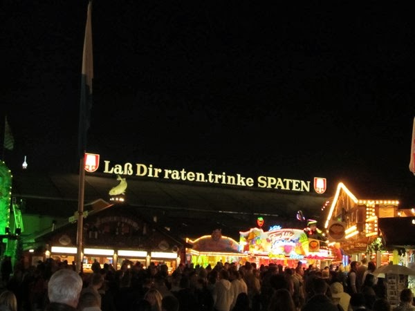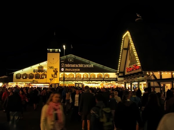 Juna oli aivan täynnä ja suurimmalla osalla ihmisistä päällään Oktoberfest – puku ja kädessä olut. Oktoberfest – alue oli myös täynnä ihmisiä ja tunnelma mitä korkeimmillaan. Kello hipoi ilta seitsemää ja taivas oli hämärtymään päin. Koko paikka oli kuin Linnanmäki x 10, jossa oli lisäksi olutta ja hyviä ruokia. Vatsat kurnivatkin jo siihen malliin, että ensimmäisestä kojusta lähti mukaan sämpylät, jotka oli survottu täyteen porsasta. Erittäin hyvää suussa sulavaa lihaa ja rapeaa nahkaa. Sämpylä maksoi 5 €, olisi vaan kaivannut kyytipojaksi olutta…