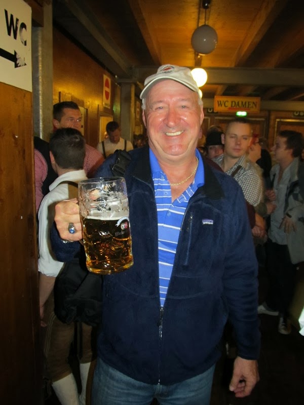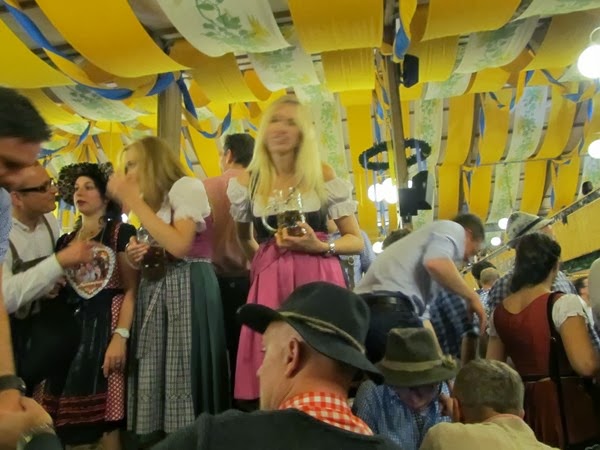 Kello oli noin 19:00 kun saimme olutteltan sisällä tuopit käteemme. Siinä sitten seinään nojailimme kaksi läpimärkää jätkää, mutta siltikään ei ollut huolen häivää. Tunnelma vaan rupesi vetämään puoleensa tai sitten olut rupesi tekemään tehtäväänsä, mutta kuitenkin omassakin kädessä rupesi tuoppi heilumaan ja saksalaiset juomalaulut raikamaan. Sinänsä hauskaa, kun oma Saksan opiskeluni on ollut täysin saksalaisten oluiden etikettien varassa. Ensimmäinen tuoppi ei ehtinyt pitkään vanheta, kun lähdin hakemaan seuraavaa. Rauol jäi juttelemaan joidenkin ranskalaisten tyyppien kanssa, joten menin metsästämään seuraavaa olutta. Olutta oli myös odottamassa joku vanhempi herrasmies, joka tervehti ja toivotti onnea oluen saantiin. Hän oli kuulemma odottanut olutta jo pitemmän aikaa eikä ollut saanut. Vinkkasin tarjoilijalle, että kaksi olutta ja muutaman sekunnin päästä oluet olivat näpissäni. Annoin toisen tälle herralle. Jäimme sitten siihen juttelemaan toviksi. Hän oli Yhdysvalloista ja ystäviensä kanssa pitkällä moottoripyörämatkalla. Oktoberfest on siitäkin puolesta hieno tapahtuma, kun siellä on ihmisiä ympäri maapalloa ja kenen kanssa tahansa pystyy juttelemaan mukavia, kun jokaisella on se yksi yhdistävä tekijä ja se on OLUT!!!