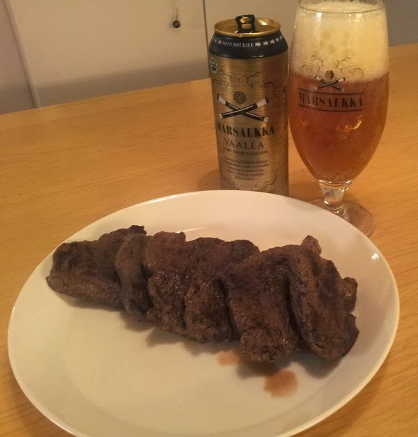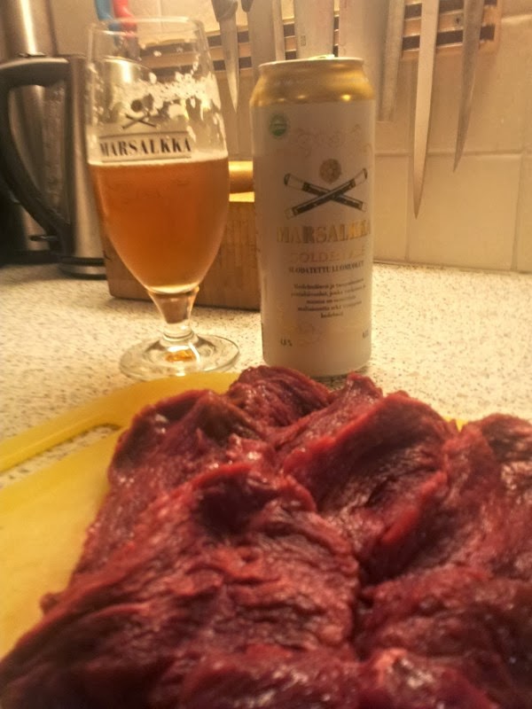 Viime kerralla, kun isäukkoni KalaHarri kävi kyläilemässä, niin kuvattiin Jaska Vaaleilla Laakereilla osa 4 ja hän toi tullessaan pakastimen täyteen itse kaatamaansa hirvenlihaa. Olen aina tykännyt hirvenlihasta ja on myös ilo seurata, että myös jälkikasvullekin maistuu. Rupesin tuossa muutama tunti sitten valmistamaan vuorokausi sitten sulamaan ottaneesta hirven ulkofileesta pihvejä ja kaivoin jääkaapista Saimaan Marsalkka Golden Ale Luomu –oluen ruoanvalmistusjuomaksi, niin siitä se idea tälle luomujutulle lähti. Hirvenliha on omassa mittakaavassani viimeisen päälle luomulihaa, vaikka se jostain lukemani perusteella ei sitä ole. Joku perustelee, ettei voi tietää mitä tämä vapaana oleva hirvi mussuttaa, niin ei voi sanoa sitä luomulihaksi. No väliäkös tällä, kun itse sanon, että luomua on niin silloin se minulle riittää. No mutta lähdetäänpäs valmistamaan evästä.