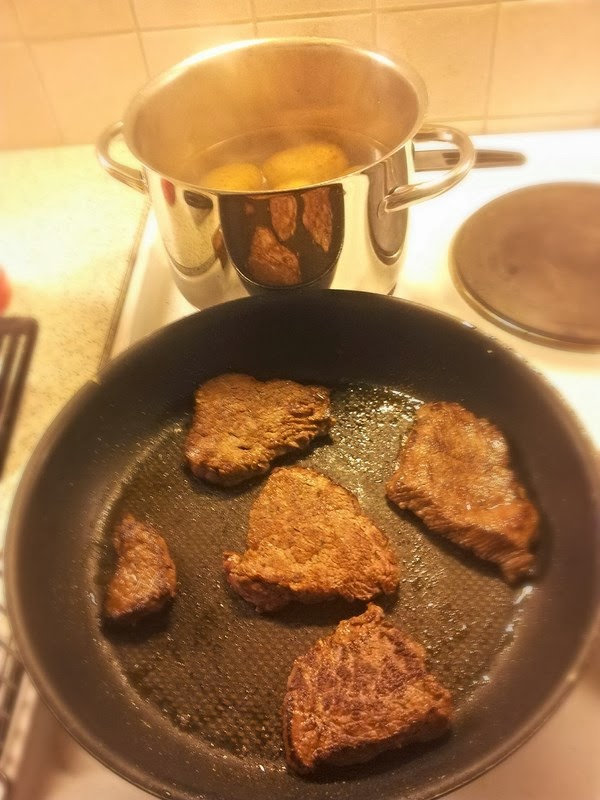 Ensiksi tietenkin tärkein eli juoma kaadetaan lasiin, maistetaan ja sitten vasta pilkotaan liha sopiviksi pihveiksi. Siitä jäi tarkoituksella ”rippeitä”, joista väännän seuraavana päivänä hirvenlihakeiton. Ensiksi esipaistoin keittolihat ja samalla laitoin perunat porisemaan kattilaan. Perunatkin ovat omasta takaa, joten luomua. Ne eivät ole vapaana olleessaan päässeet syömään mitä sattuu 🙂
