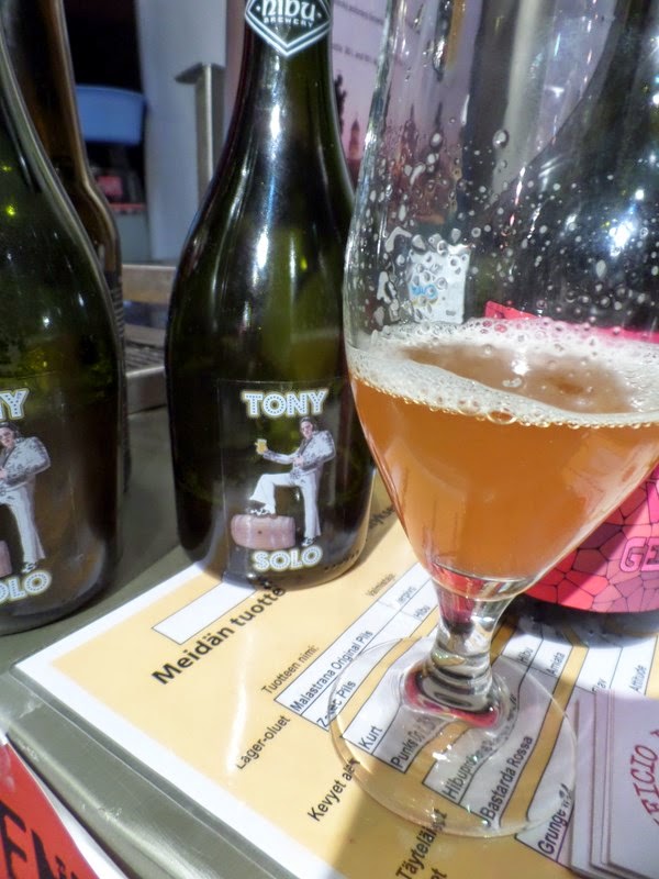 Seuraava etappi oli Monditalyn tiski, jossa ääntä riitti. Siellä ensimmäisenä pääsin maistamaan Hibu Tony Solo Amarone Saisonia. Tuoksu hiveli sieraimia ja se oli kuulemma sitä Amaronea (jonkin sortin italialainen punaviini) ja maultaan myöskin hyvin mielenkiintoinen ja vieläpä hyvällä tavalla. Hedelmiä, punaviiniä ja happamuuttakin on kivasti mukana. Tony Solon jälkeen lasiin kaatuikin sitten vadelmainen olut Elav Beat Weizen Generation. Tässä positiivista oli juuri se, että vadelma maistui aidolta vadelmalta eikä miltään aromilta. Hyvin erikoinen olut. Kevyt, hapan ja tulee mieleen Berliner Weisset. Ihan ok, muttei mikään erityinen. Italia -tiskin viimeisenä pääsin maistamaan elämäni ensimmäisen italialaisen Imperial Stoutin ja tässä suuri plussa oli, että se tarjoiltiin juuri sopivan lämpimänä. Lasiin kaatui Elav Dark Metal. Tämä Chinookilla humaloitu Imperial Stout valui loistavasti kurkkuun ja tarjosi erittäin mieleenpainuvan makuelämyksen. Lähes kaikki tähän mennessä täällä tapahtumassa nauttimani oluet olivat olleet liian kylmiä, mutta nyt tehtiin oluelle kunniaa ja se oli just eikä melkein oikein lämpöinen. Erittäin hyvänmakuinen Imperial Stout.