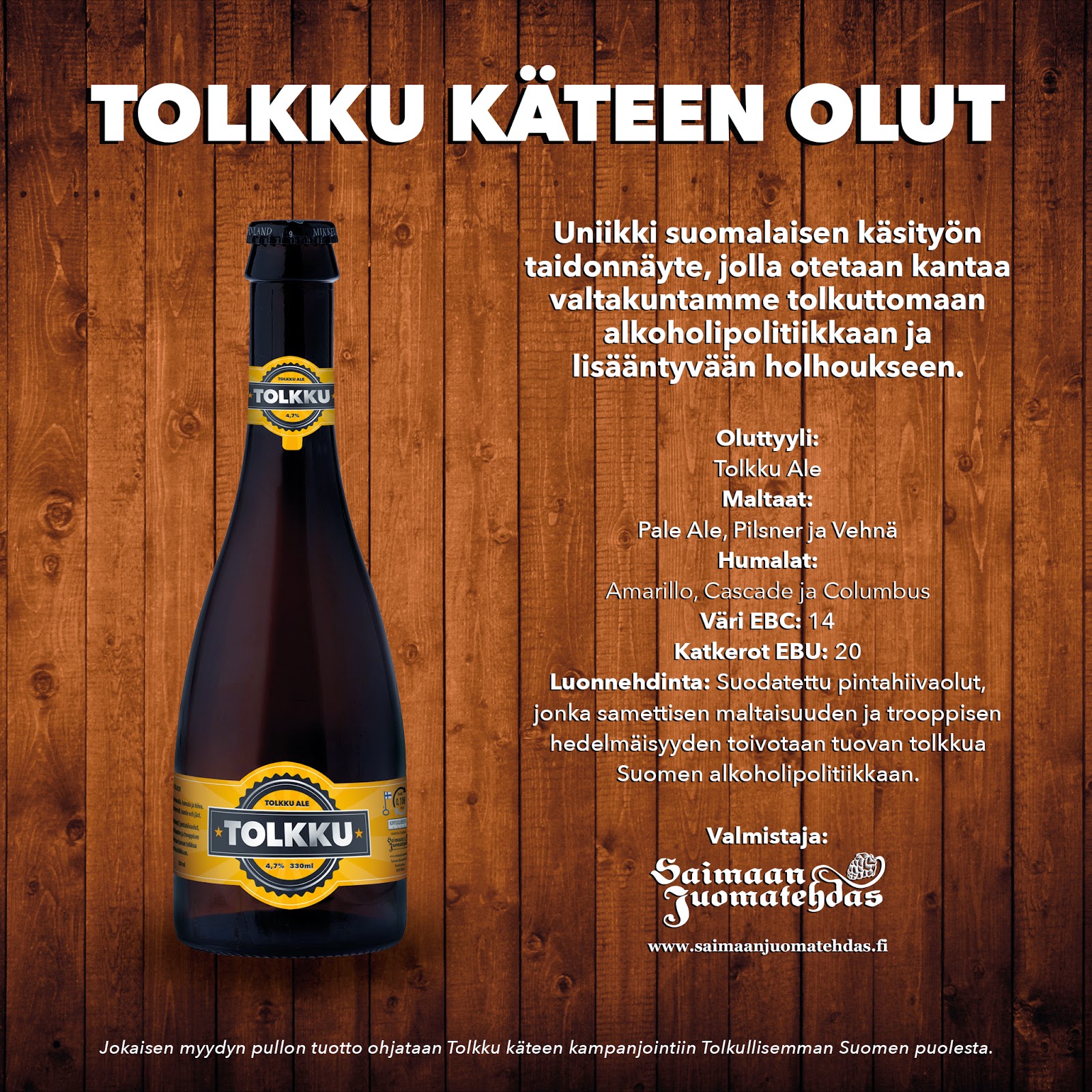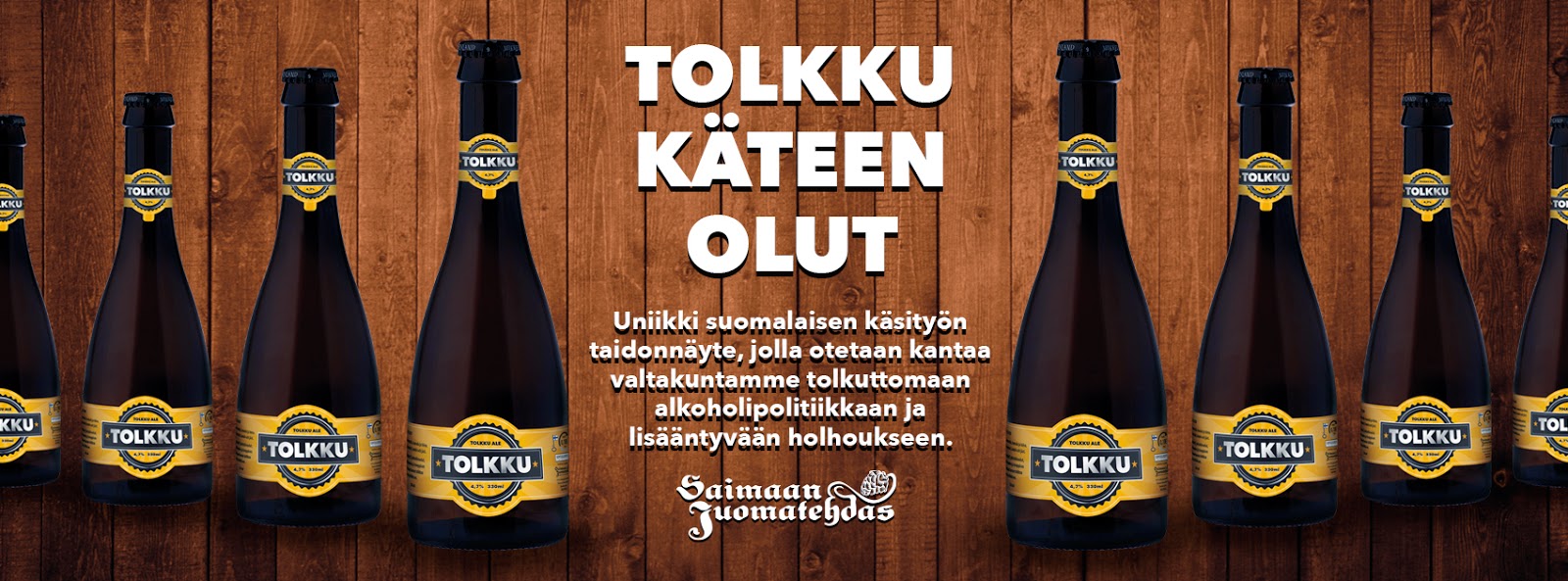 Ja heti ensimmäisellä soitolla tärppäsi. Kumppaniksemme Tolkku nimisen oluen tuottajaksi saimme Saimaan juomatehdas Oyn. Iso kiitos heille. Nyt näyttää siltä, että tästä Suomen ensimmäisestä “poliittisesta oluesta” on tulossa menestys. Ja miksi ei tulisi sillä täällä puolella olemmehan viestinnän ja markkinoinnin ammattilaisia jotka tekevät työtään palavin silmin ja sydämin hyvän asian puolesta. Oluen laadun taas takaa palkittu panimo.