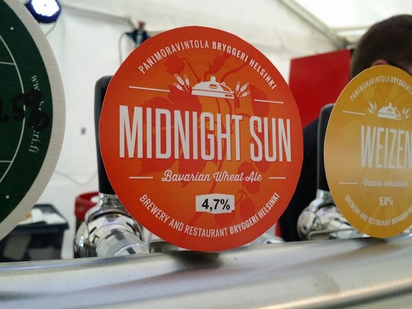Juomanpesupisteellä oli lähes koko ajan pitkä jono, joten sen perusteella näytti, että ihmisellä juomatkin upposivat. Kun selviydyin jonosta puhtaan lasin kanssa pois, niin kävelin maistamaan Bryggeri Helsingin uutuuden Midnight Sun Bavarian Wheat Alen. Saksalainen humala Mandarina Bavaria on hyvin erotettavissa ja tämä oli juuri sellainen kesäinen juoma. Ei mikään erityinen, mutta juotava.