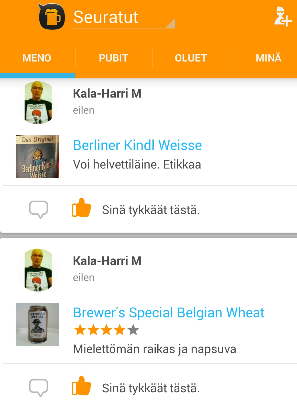 Tästä näkee KalaHarrin pikaiset arviot ja annetut tähdet Pint Please -sovelluksen puolelta.