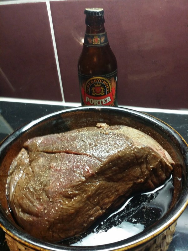 Heitä liha kippoon ja kaada olutta lihan päälle. Jätä hieman myös kokille, ettei pääse kuivumaan pahasti. Laita liha jääkaappiin marinoitumaan. Kääntele tarvittaessa, jos ei koko liha peity Portteriin. Liha marinadin kanssa leivinuuniin, jossa n. 200 astetta ja anna olla siellä pari tuntia. Laita päälle folio ja takaisin uuniin. Saa olla vielä n. 8 tuntia. Lisää tarvittaessa keitettyä vettä, jos neste meinaa kokonaan hävitä. Ota pois uunista ja anna jäähtyä. Leikkaa ohuita siivuja esim. leivän päälle tms. Ropsauta reilusti suolaa päälle, niin maku vaan paranee. Helppoa ja hyvää.