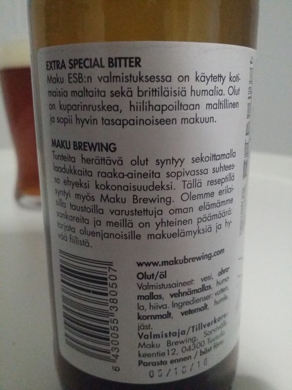 ”Maku ESB:n valmistuksessa on käytetty kotimaisia maltaita sekä brittiläisiä humalia. Olut on kuparinruskea, hiilihapoiltaan maltillinen ja sopii hyvin tasapainoiseen makuun… vaikka koko iltapäiväksi perinteisessä pubissa!”