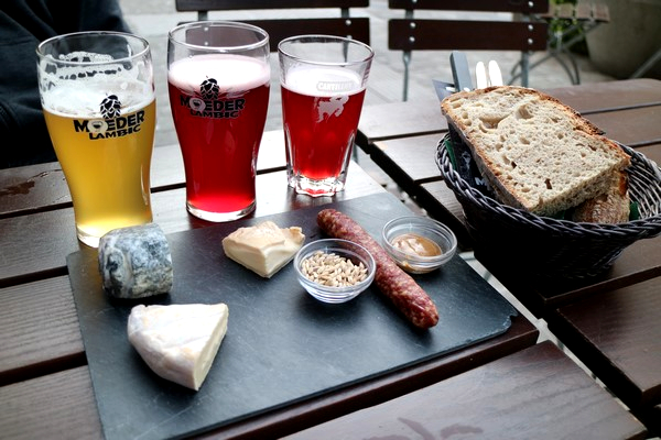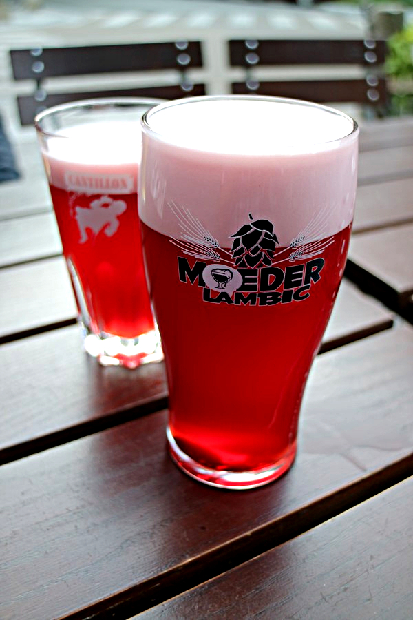 Hotellissa muutaman minuutin lepotuokio ja siitä melko nopealla tahdilla takaisin kylille. Oma must -kohteeni oli päästä oluelle Moeder Lambic Original -nimiseen ravintolaan ja se otettiinkin suunnaksemme. Suunnistaminen kannatti, koska olimme taivaassa. Hanalistalta löytyi mm. Cantillon Kriek Cask -versiona ja samaisen panimon Rose De Gambrinus myöskin caskista. Hanoja oli lähes 30, joten valinnan varaa piisasi, vaikka pidemmäksikin illaksi. Cantillonin kaveriksi juustolautanen ja Cantillon makkaraa. Kriek oli caskista ammennettuna ihana pehmeä ja samalla hedelmäinen ja sopusuhtaisen hapan. Sanoin en pysty kuvailemaan, että miltä se maistui juustojen kaverina, mutta viihdyimme paikassa pitkän tovin. Hintatasoltaan ei mikään edullisin paikka, mutta sitäkin viihtyisämpi.