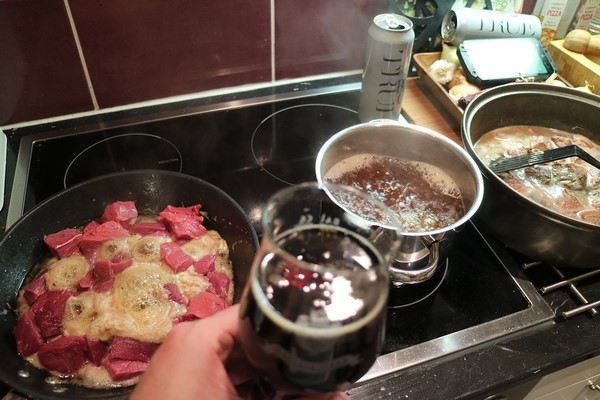 - Lisää pataan keitetty lihaliemi ja loput oluet. Muista, että kokin pitää testata oluen laatu ja maistella sitä vähintään kolmannes kokonaismäärästä. Tässä kannattaa ehkä jopa taktikoida ja ostaa olutta reilummin.