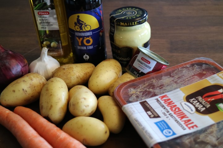 Naapurin Maalaiskanan Kanasuikale Presidentin kastikkeella sisältää mausteena mm. soijakastiketta, suolaa ja muita mausteita, joten käyttämieni mausteiden määrä pysyi hyvin vähäisenä. Tumma olutvalintani perustui siihen, että tarkoituksena oli valmistaa Karjalan paistin vastine ilman punaista lihaa. Olut toi mukanaan ruokaan täyteläisyyttä ja pientä paahteisuutta. Ruoan kypsyessä uunissa 7v. tyttöni kysyi, että onko uunissa kypsymässä leipä, koska tuoksu oli hyvin mallasvoittoinen. Makujen puolella maltaisuus oli myös läsnä, muttei niin vahvasti. Kokonaisuudesta tuli ruoka, joka maistui tuhdimmalta kuin mitä lopulta oli ja tämä itseäkin hieman yllätti. Monet ihmiset ovat vähentäneet punaisen lihan syöntiä (perheemme mukaan lukien), joten tässä on resepti, jonka myötä voit silti nauttia karjalan paistin ihanasta mausta ilman punaista lihaa, joten näin syntyi tällainen kanalanpaisti