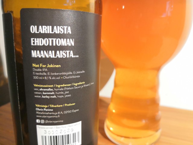 Tällä viikolla blogissani on teemana Olarin Panimo ja sehän tarkoittaa, että luvassa on viikon jokaiselle päivälle olutarvio kyseinen panimon oluesta. Aloitetaan viikko Not For Jokinen -nimisellä tupla IPAlla.