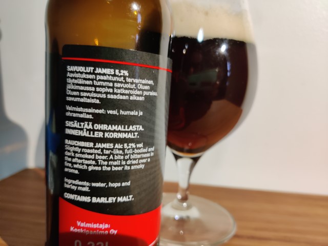 Olen lukuisia kertoja blogissani mainostanut oleva suuri savuoluiden ystävä ja nyt lasiini kaatuu Koskipanimon valmistama James Savuolut. Se on aina hieno hetki, kun pääsee maistamaan savuisia mallasjuomia.